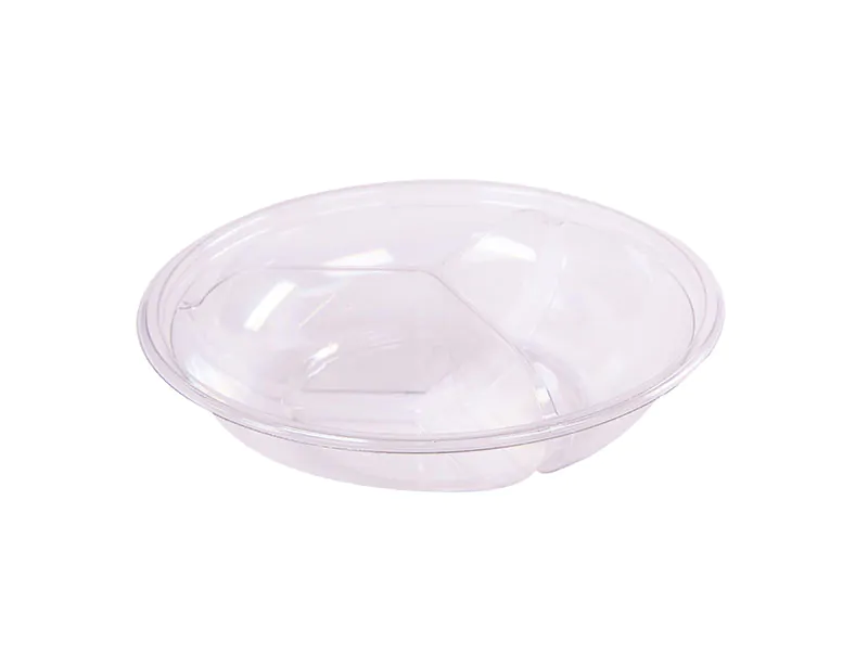 43 oz. clear 10″ round bowl with 3 compartments for produce.