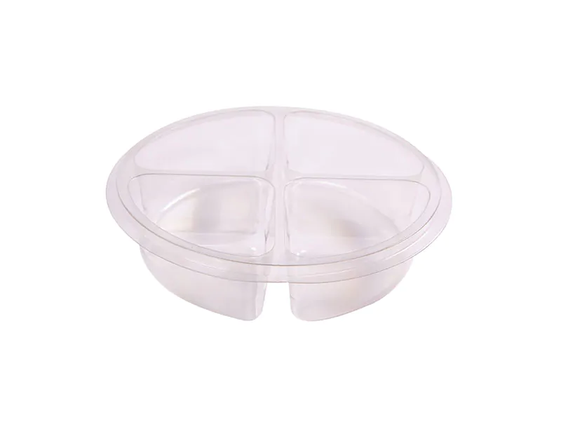 5.9 oz. max capacity per compartment, clear, PETE, 7″ round container, 4 compartments. 23.6 oz. total