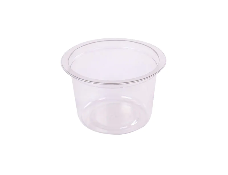 17 oz. to overflow, clear, PETE, HPP, 4.5″ round container wide flange and film seal capabilities.