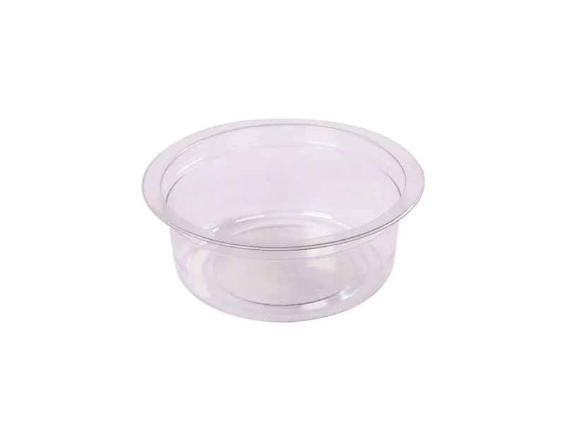 10.3 oz. to overflow, clear, PETE, 4.5″ round container wide flange and film seal capabilities.