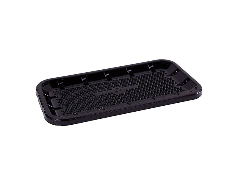 Black, PETE, shallow rectangular meat tray with patented honeycomb bottom.