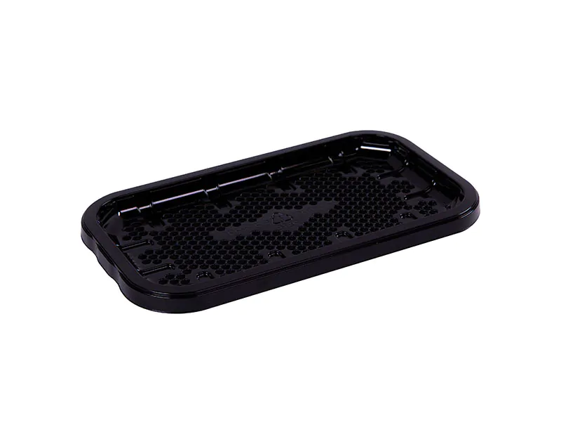 Black, PETE, shallow rectangular meat tray with patented honeycomb bottom.