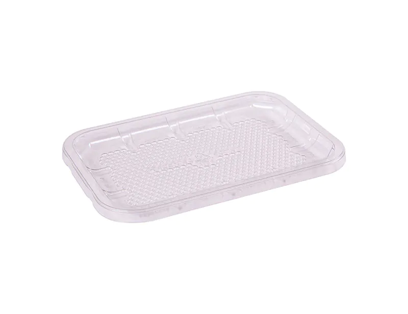 Clear, PETE, shallow rectangular meat tray with honeycomb bottom.