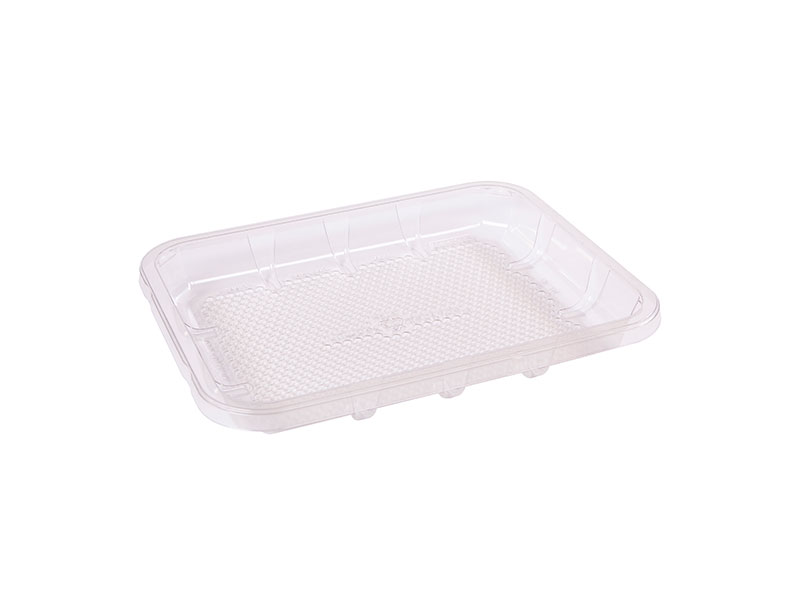 Clear, PETE, deep rectangular meat tray with honeycomb bottom.