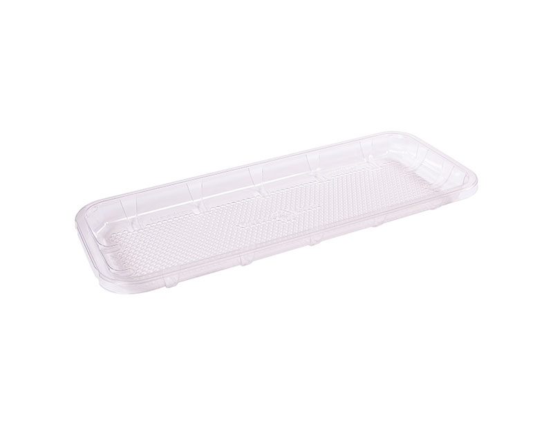 Clear, PETE, shallow rectangular meat tray with honeycomb bottom.