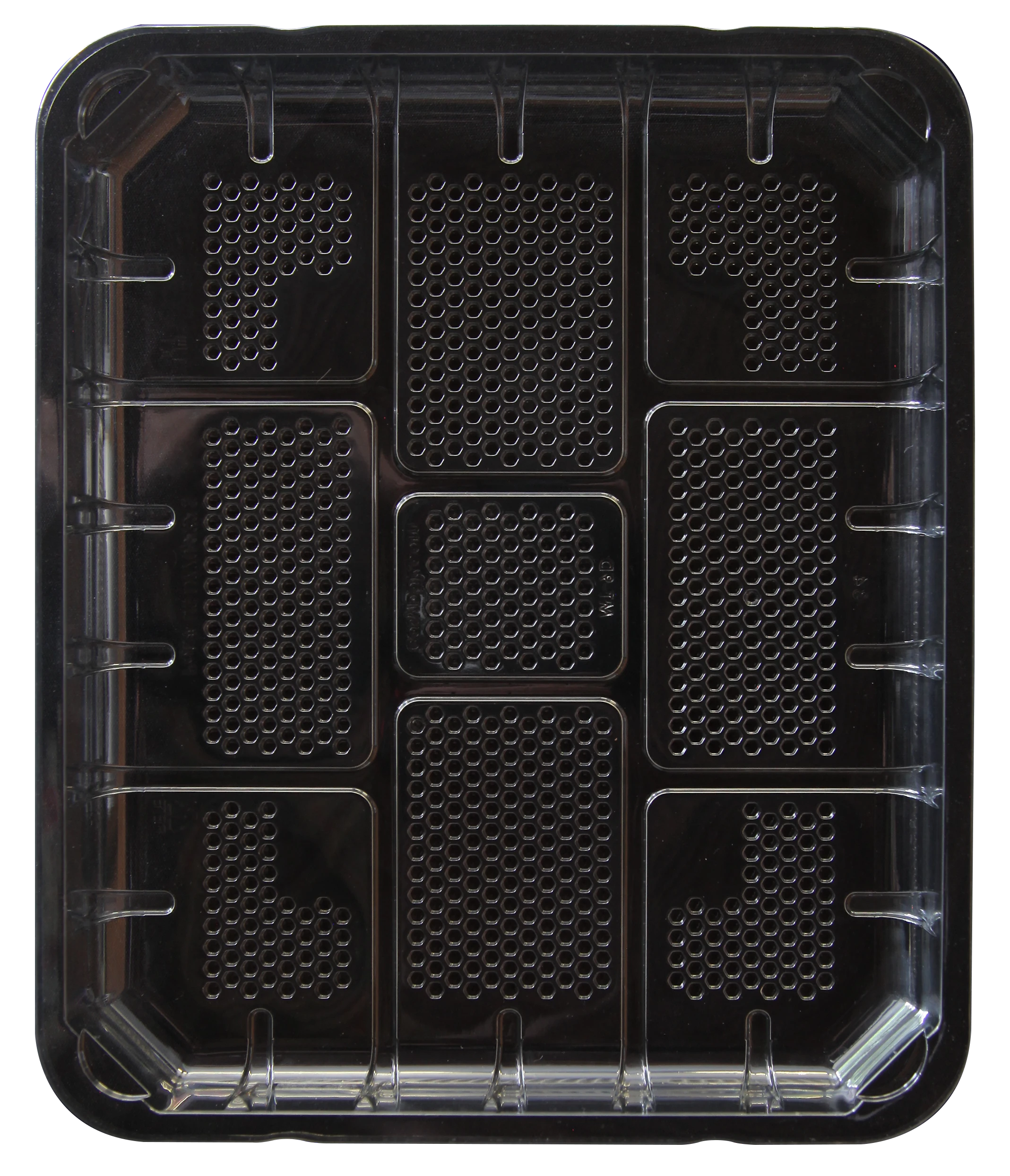 Clear, PETE, deep rectangular meat tray with honeycomb bottom.