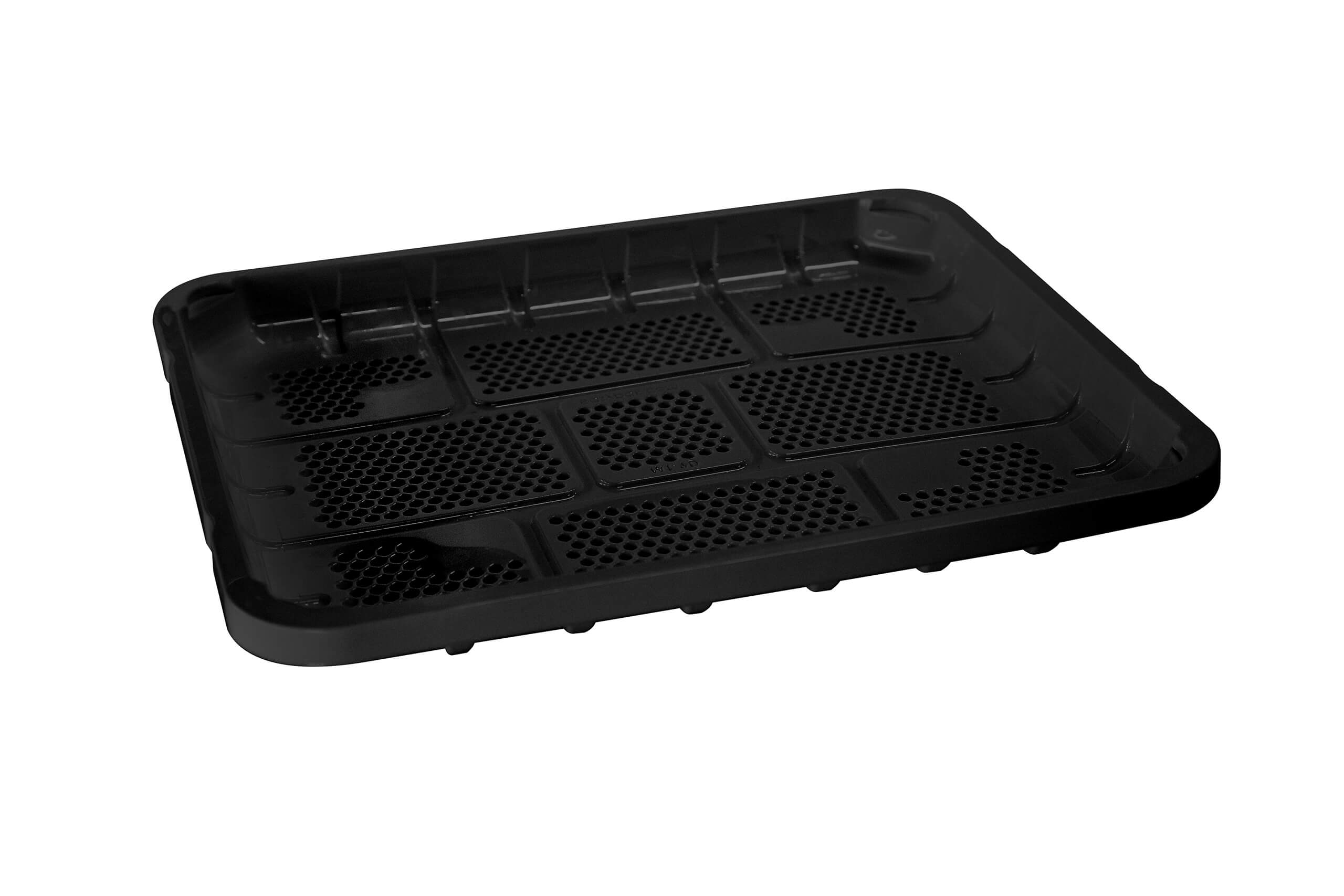 Black, PETE, deep rectangular meat tray with honeycomb bottom.